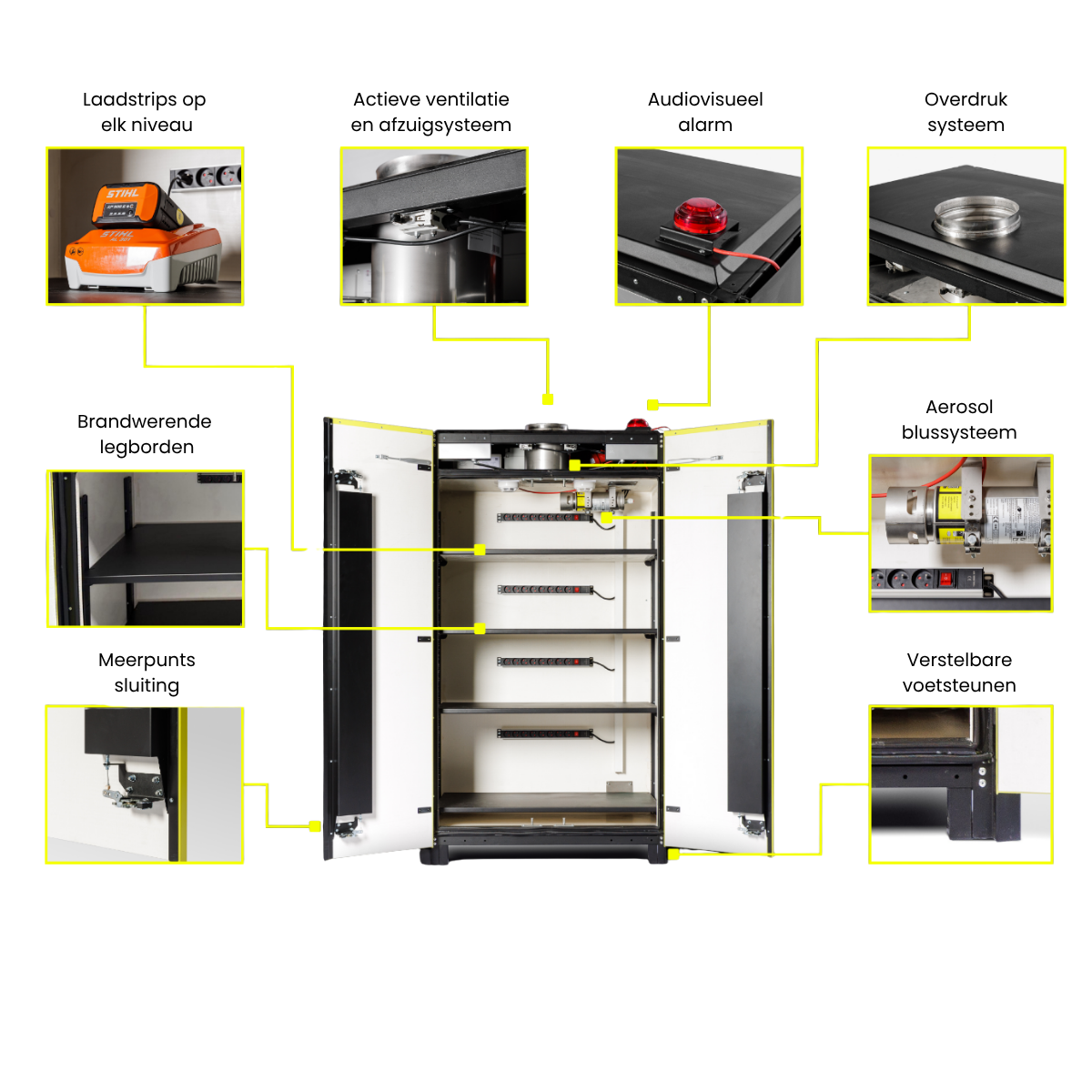 - Lithium brand beheersen in de kast om brandoverslag te vermijden.